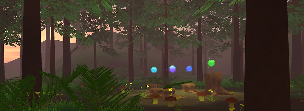 In Sound of the Wisps, players walked through a forest until happening upon four glowing spheres (the “wisps”). Once players got close, the wisps started playing music and dancing. Their music was spatialized so moving towards a wisp would make that character’s part of the music sound closer. Mechanics were developed so players could interact with the wisps to explore hidden elements of the music.